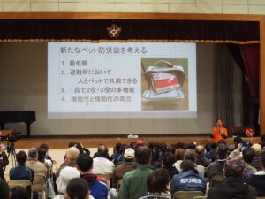 「ペット防災」の講演はヤマザキ動物看護大学の福山貴昭先生によって中学校および大学の2ヵ所で行われた。講演では南海トラフ巨大地震がおこった際の地震、津波の広がりについて、ペットのために準備しておく備蓄品、その優先順位、ペット防災袋などについて解説された。また、平成28年熊本地震の際に、避難所として1,300~1,600人の避難者、約100頭の犬猫を受け入れた益城町総合体育館でおこった出来事を具体的に紹介した。ペットの飼い主家族による「飼い主の会」の結成、ペット飼育のルール作り、ペットのマナー啓発および動物保護団体に預ける際の注意喚起など、参考となる事例に参加者は耳を傾けた。